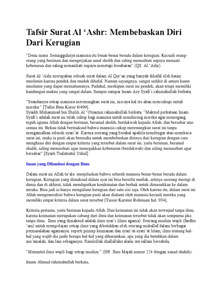 It contains three verses (āyāt). Surat ini berisikan penjelasan tentang hakikat keuntungan dan kerugian di dalam kehidupan, serta peringatan tentang pentingnya waktu yang dijalani oleh. Seandainya allah menjadikan hujjah hanya dengan surat al 'ashr ini, maka itu sudah menjadikan hujjah kuat pada manusia. Sebab, umur merupakan nikmat terbesar yang diberikan allah swt kepada manusia. Meskipun begitu, surat ini mengandung makna yang sangat.