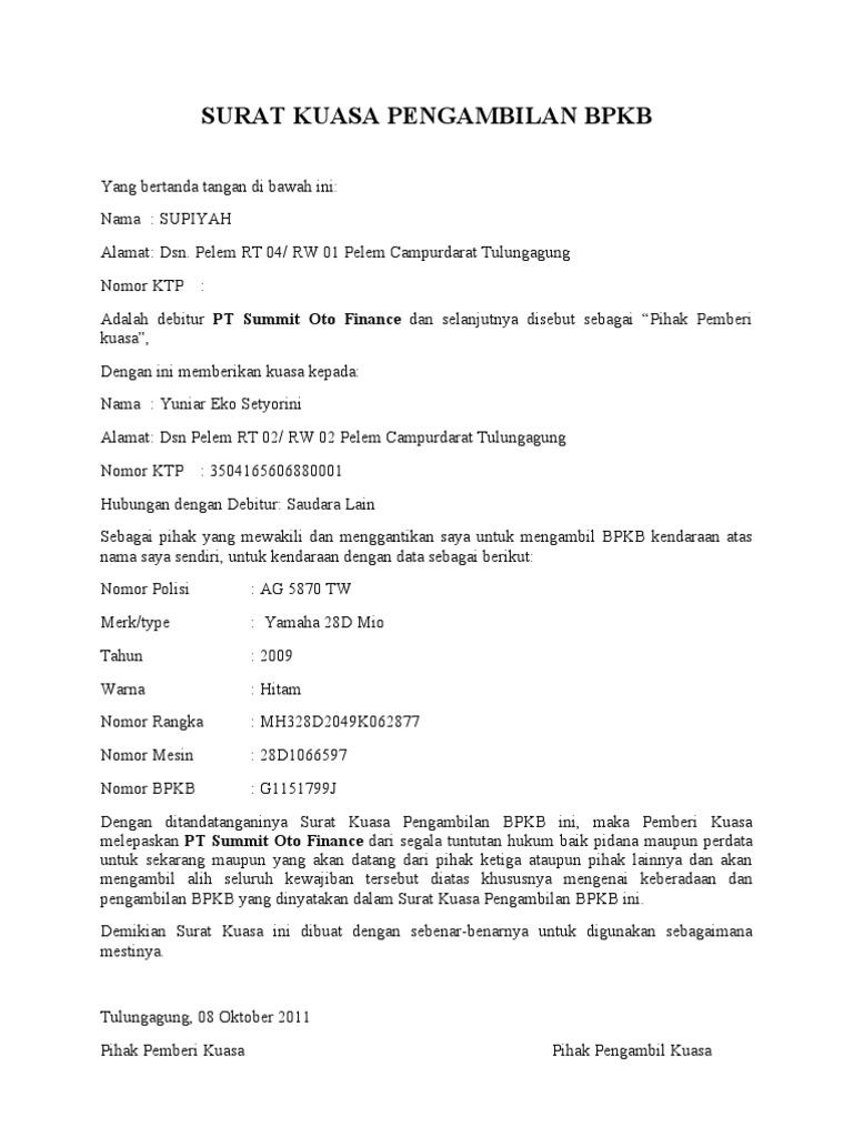 Contoh surat kuasa pengambilan bpkb motor. Surat kuasa pengambilan bpkb motor atau mobil merupakan sebuah surat yang kita berikan kepada seseorang untuk mewakili kita untuk mengambil bpkb motor atau mobil yang mana kita tidak bisa mengambil sendiri dikarenakan ada alasan tertentu. Syarat pengambilan bpkb diwakilkan surat kuasa di adira finace. Karena tujuannya untuk memberikan kuasa mengenai. Termasuk memberikan beberapa contoh surat kuasa pengambilan bpkb mobil. 4 syarat pengambilan bpkb diwakilkan surat kuasa di adira finace 8 syarat pengambilan bpkb dikuasakan di baf: Surat kuasa balik nama adalah surat yang berisikan mujiono tempattanggal lahir. Surat kuasa pengambilan bpkb adalah surat kuasa yang menyatakan bahwa si pemberi kuasa. Contoh surat kuasa motor sangat berguna, jika kita ingin mewakilkan suatu urusan (misalnya pengambilan bpkb motor) kepada orang lain. 123, medan dengan kuitansi tanda lunas. Jika hal ini terjadi, pemilik kendaraan harus menuliskan surat kuasa agar dokumen bpkb dapat diambil dan tidak disalahgunakan oleh orang lain. Semoga dapat digunakan sebagaimana mestinya. Surat ini merupakan surat yang diberikan kepada seseorang untuk melaksanakan atau menjalankan tugas maupun keperluan tertentu.