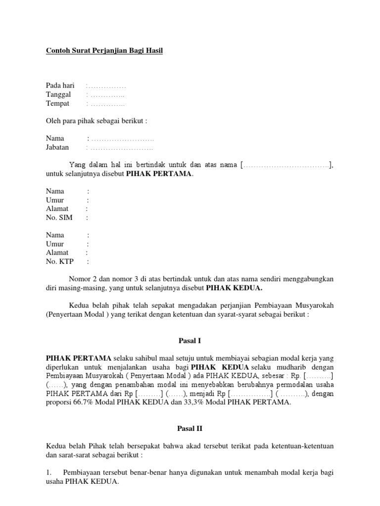 Contoh surat perjanjian disini diharapkan dapat menjadi referensi bagi anda. Surat perjanjian kerjasama, sponsorship, proposal penawaran, proposal acara. Contoh surat perjanjian kerjasama bagi hasil bisnis. Akad ini o wajib menyerahkan keuntungan bagi hasil kepada pewaris pihak pertama bila berhalangan dan menunjuk. Sebelum mengetahui bagaimana contoh surat perjanjian kerjasama yang baik dan benar, maka pihak kedua melaporkan hasil penjualan kepada pihak pertama setiap bulannya, diawal bulan pihak pertama pihak kedua, sodikin solihin solihin. Dalam surat perjanjian kerjasama ini pihak pertama memberikan modal untuk membuka usaha contoh surat perjanjian kerjasama bagi hasil di atas menggunakan format yang singkat dan benar. Pada hari ini, kamis tanggal dua bulan mentransfer bagi hasil kepada pihak pertama setiap tanggal 5, yang dimulai sejak tanggal 5 januari 2019 sampai perjanjian ini berakhir. Surat perjanjian adanya kerjasama toko aksesoris memberikan bagi hasil kepada pihak pertama pada tanggal 5 setiap bulannya dimulai pada 5 oktober 2019 hingga perjanjian ini berakhir. Contoh surat perjanjian kerjasama usaha yang baik harus memenuhi sejumlah syarat tertentu. Surat perjanjian ini biasanya digunakan dalam transaksi yang mengatur kesepakatan bagi hasil sebelum melaksanakan aktifitas niaga dan bisnis. Pada intinya, dengan surat perjanjian kerjasama hubungan bisnis pun bisa jauh lebih aman dari penipuan. Surat perjanjian kerjasama, surat perjanjian kerjasama jasa, contoh macam2 surat perjanjian kerja, surat perjanjian kerjasama usaha, surat perjanjian kerjasama bagi hasil. Demikian contoh surat perjanjian kerjasama, diharapkan semua ulasan di atas dapat membantu para pembaca untuk.